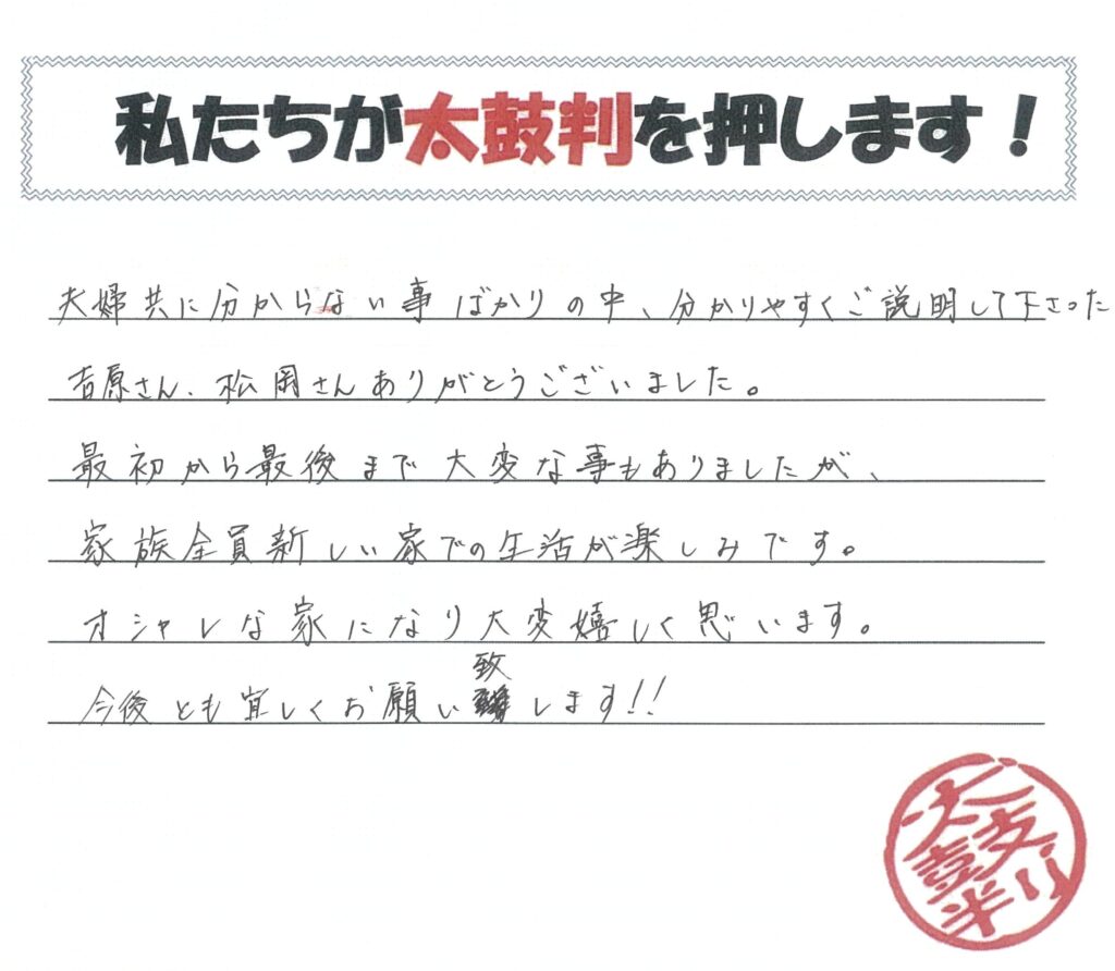 夫婦共に分からない事ばかりの中、分かりやすくご説明して下さった吉原さん、松岡さんありがとうございました。最初から最後まで大変な事もありましたが、家族全員新しい家での生活が楽しみです。オシャレな家になり大変嬉しく思います。今後とも宜しくお願い致します!!
