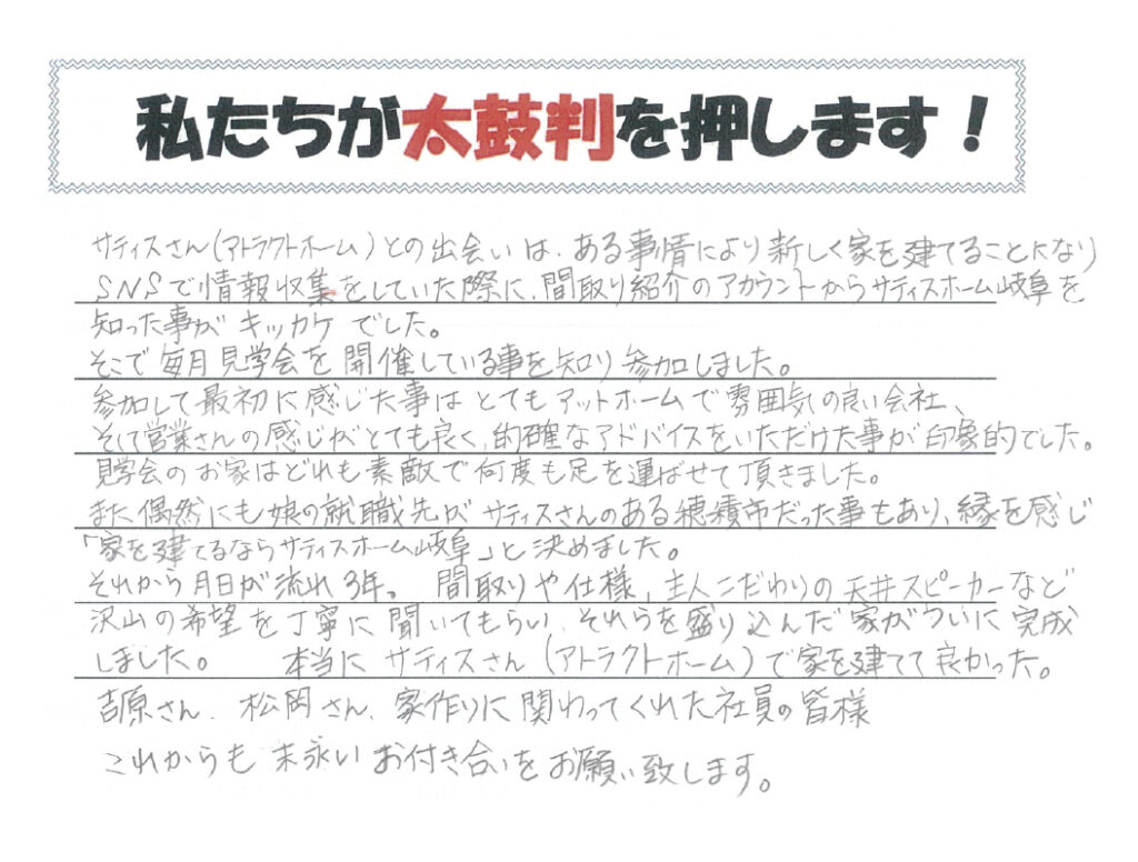 サティスさん(アトラクトホーム)との出会いは、ある事情により新しく家を建てることになりSNSで情報収集をしていた際に、間取り紹介のアカウントからサティスホーム岐阜を知った事がキッカケでした。