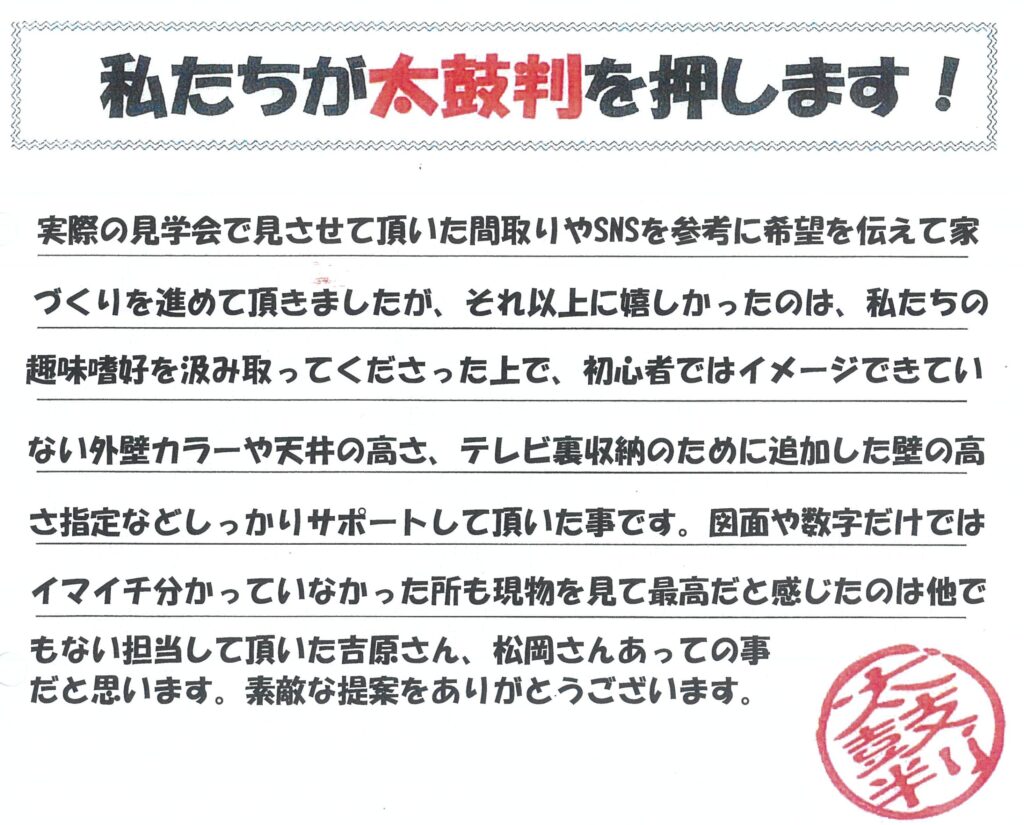 図面や数字だけではイマイチ分かっていなかった所も現物を見て最高だと感じたのは他でもない担当して頂いた吉原さん、松岡さんあっての事だと思います。